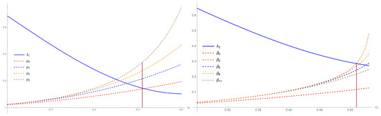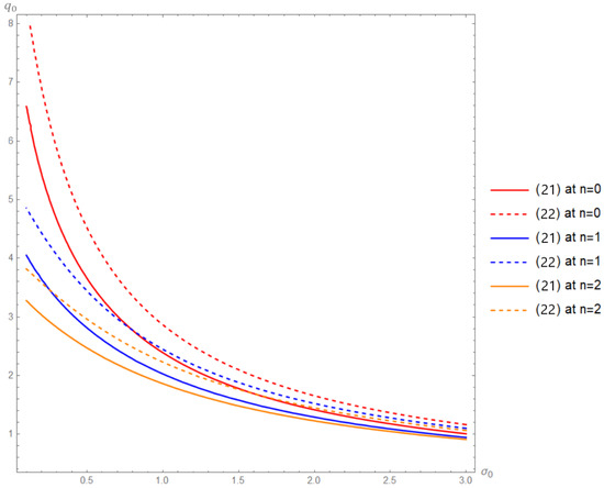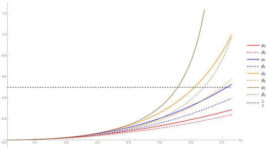 for some . Figure 1 shows that sequence crosses faster than sequence , which means that it is possible to prove that with fewer approximations. For example, we notice when that the , while Figure 2 shows the difference between conditions (13) and (14). We notice when that whereas the sequence needs the eleventh approximation to exceed .