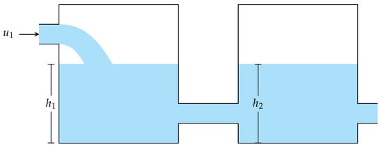 Coupled tanks model considered in the numerical example. The level on each tank , , measured independently from each other, are the system states, while the control input is the inlet flow into the first tank.