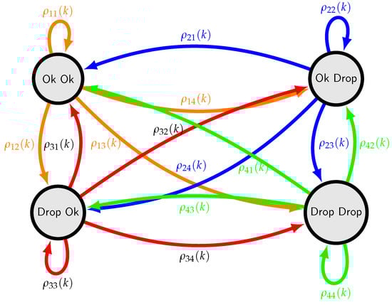 Regarding the network modeling, we assume that each tank is far away from the other; therefore, data gathered from each sensor is transmitted via two distinct networks. Network 1 transmits the measurement of the first tank, and Network 2 transmits the measurements of the second tank. The transmission of the measurement signals through a semireliable communication network is modeled by using a simplified Gilbert–Elliot model, as done in [30] while the packet dropout is represented by the zero-input approach from [31], meaning that when a packet loss occurs, we assume that the value of the received signal is null. Hence, the complete network behavior is represented by four distinct operation modes, as illustrated by Figure 3. The first one is that where all the measurements are correctly transmitted (called “Ok Ok” in Figure 3); the second one considers that the measurement on the first tank is successfully transmitted, but occurs a packet dropout of the measurement from the second tank (called “Ok Drop” in Figure 3); the third case is the opposite of the second one (called “Drop Ok” in Figure 3); and the last mode represents the case where all measurements were lost (called “Drop Drop” in Figure 3).