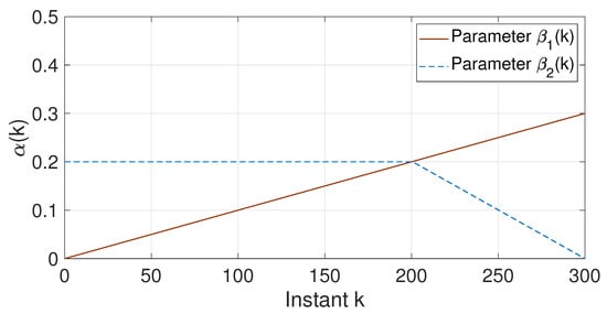 where , and represent the elements of ith row and jth column from the following matrices , and of Equation (41). Furthermore, the time evolution of the time-varying parameters and is illustrated by Figure 4.