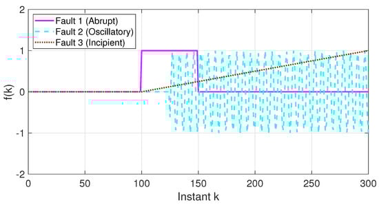The representation of the three faults that were inflicted in the system during simulations. The magenta curve represents an abrupt fault, the cyan curve denotes an oscillatory fault, and the brown curve is the incipient fault.