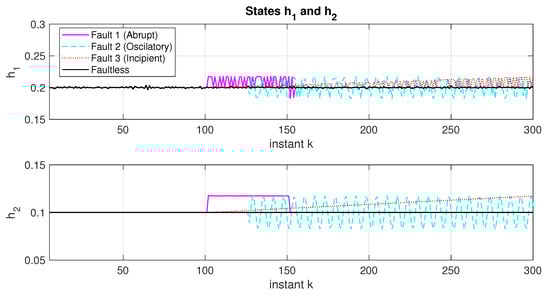Figure 6 presents the system’s states when subjected to all three fault cases, and also a case without fault. From Figure 6, it is possible to observe that the faults do not surpass of the nominal state value.
