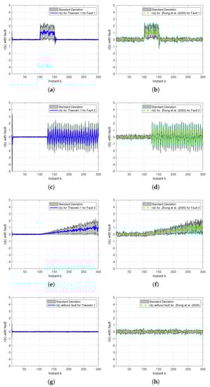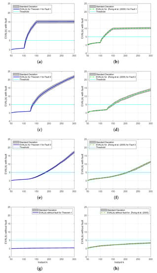 The evaluation function obtained for FDF designed by using Theorem 1 under the assumption of knowledge of all modes (to the left), and the FDF provided by [8] (to the right). Both designs are subjected to three type of faults, and also the situation without fault. (a) Evaluation function for FDF designed via Theorem 1 subjected to Fault 1. (b) Evaluation function for FDF designed via [8] subjected to Fault 1. (c) Evaluation function for FDF designed via Theorem 1 subjected to Fault 2. (d) Evaluation function for FDF designed via [8] subjected to Fault 2. (e) Evaluation function for FDF designed via Theorem 1 subjected to Fault 3. (f) Evaluation function for FDF designed via [8] subjected to Fault 3. (g) Evaluation function for FDF designed via Theorem 1 without fault. (h) Evaluation function for FDF designed via [8] without fault.