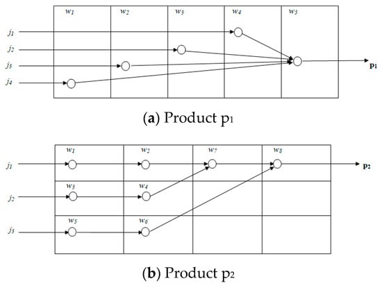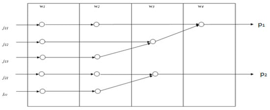 In the case of the assembly flow-shop problem, the workstation can be used to perform exactly similar or different operations for multiple products (refer to Figure 2). Here, parts are processed serially through the same set of workstations (w1, w2, … wn) to manufacture products (p1, p2 … so on); these products need several parts (j1, j2 … so on) and/or subassemblies that subsequently require a series of machining/sub-assemblies at multiple work stations: w1, w2, … wn. For example [3,4], in gearbox processing, milling machines at the first stage perform roughing operations, and then machining centers at the next stage perform finishing operations. Finally, the product is assembled on the last workstation with the remaining parts (say a team of workers assembles them with other parts, such as casing, shaft, etc.), forming the final product. A consolidated survey of categories of assembly flow-shop models and their solution methodologies is available in the literature [4,5]. There are huge avenues for research in this area [5], as it has received less attention than other areas of scheduling.