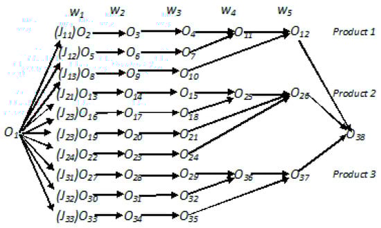 The objective of the present work is to study and analyze the appropriate technique for rescheduling in the event of a system disruption in any flow-shop with part manufacturing and their subsequent assembly operations. Thus, the flow-shop manufacturing system combined with the adopted assembly operations is presented in Figure 3. Where, the beginning and end of the flow-shop are shown by dummy operations O1 and O38, respectively. Operations O12, O26, and O37 performed on w5 represent final assembly and three products: Product 1, Product 2, and Product 3. Each product is made up of several parts, and each part is processed on workstations in a technological sequence. For example, Product 1 is made up of parts J11, J12, and J13, where the operations of the first part J11 follow the sequence O2, O3, and O4 machining operations; O11 is a subassembly operation, and O12 is an assembly operation of the product. Machining operations are performed on all workstations except the last two, which perform only assembly operations. Thus, the system on hand has H total products and Jh parts per product with J total parts. The directed graph of the operation-based representation of AFSP is shown, where O1 and O38 are dummy sets of operations, O2 to O37 stand for actual operations as per the predefined manufacturing flow, J11 to J33 represent parts, and w1 to w5 represent workstations (refer to Figure 3).