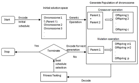 The genetic algorithm mechanism starts by encoding the feasible schedule to produce a list of genes (parent chromosomes) as the initial solution space (refer to Figure 4). Where each gene represents an operation and a chromosome (list of genes) represents a set of operations for all workstations (the entire schedule). For deciding the sequence of operations, the operations for each product are structured in a specific sequence (refer to Figure 3) and are reproduced as chromosome structure. Such a chromosome structure for the first product (h = 1) is depicted in Figure 4a, where each chromosome is divided into subchromosomes that correspond to the sequence of operations on the wj workstation. Similarly, for deciding the sequence of products, see Figure 3, and the operations corresponding to the final assembly of all products are reproduced as a chromosome structure, as shown in Figure 4b. In the first phase, the sequence of operations on all workstations is decided for every individual product to minimize the make-span of each one. In the second phase, the sequence of the product is decided by obtaining the minimum make-span of all products. The adopted procedure to generate the initial schedule using a genetic algorithm-based heuristic for both phases is presented in Figure 5.