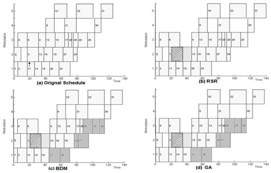 Though the data for disruption is generated randomly, for illustration, it is taken as Tf = 20, and Df = 15 (refer arrow in the below Figure 6a) for the numerical example as referred in the above Table 4. The data given in Table 4 is processed on the computational programs for each of the three rescheduling methodologies, i.e., RSR, BDM, and GA, developed for generating a new schedule. The computational program is coded in MATLAB for each of the methodologies considered. Computations are executed on a system with the Windows operating environment. The number of generations in GA is kept at ten, as it does not show any significant improvement after ten generations. The original schedule generated by the initial method and the rescheduled schedule generated by the three rescheduling methods are represented using a Gantt chart (refer to Figure 4). The arrow position in Figure 6a denotes the instant of failure, and the hatched region (refer to Figure 6b–d) denotes the failure duration on the breakdown workstation (w2).