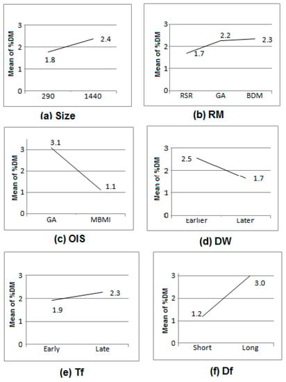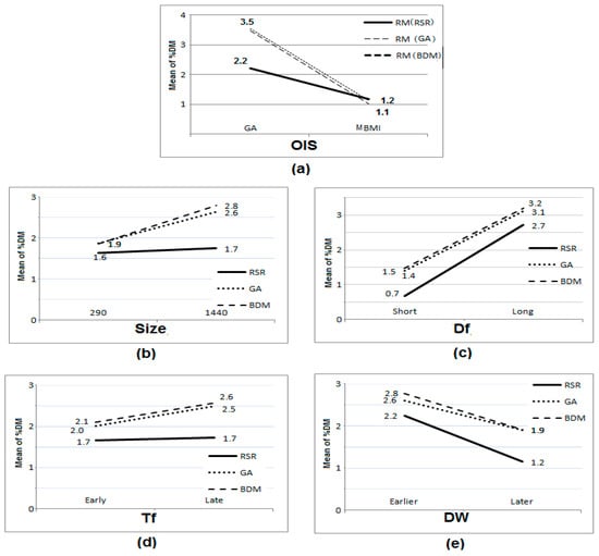 This experiment yields values for the performance measures as well as the make-span and computation time for each design of the experiment. With three replications, there will be 288 observations for each performance measure. The results of the computational experiment include the original make-span (the make-span of the schedule before disruption occurs), the make-span obtained in ith replication, and the percent deviation of make-span. The effects of the factors on the percent deviation of the make-span are determined using statistical techniques, such as the plotting method and the analysis of variance, as discussed below [45]. The plotting method is used to study the influence of individual factors and the interaction effects of the different factors on the performance measure. The plot obtained using the mean percent deviation of make-span values for all factors is shown in Figure 7, which shows that the least slope of the plot is for Tf, whereas OIS indicates the highest slope.