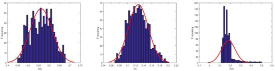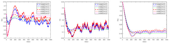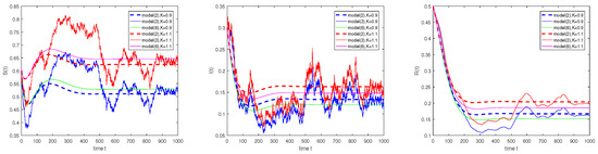 Assume that , , , , , , , , and . Obviously, . For model (2), the endemic equilibrium is globally asymptotically stable. In model (3), if , then and . Based on Theorem 4 (a), the disease-free equilibrium of model (3) is globally asymptotically stable. It reveals that of the models (3) and (6) are close to the environmental capacity K, but and are close to 0. When , and , the disease is persistent. In addition, the intensity of white noise can suppress the disease outbreak. Figure 1 shows the curves of under these parameters.
