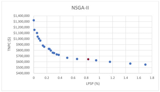 - The Pareto front plots of TNPC vs. LPSP for the four suggested optimization algorithms showed a clear trade-off between the two objectives.
