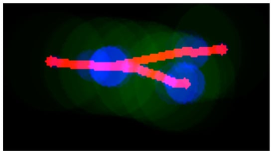 where is the radius of the blue circle; is the shorter width and height of the 2D object trajectory; is the input 2D object trajectory; is the width; and is the height of the 2D object trajectory. The distance ratio of the blue circle was adjusted based on the size of the 2D object trajectory to calculate the overlapping area of the two object trajectories. A higher distance ratio indicates that the overlapping area between two objects is larger, and the blue color would be darker. In contrast, a lower distance ratio indicates that the overlapping area between the two objects is smaller, and the blue color would be lighter. Furthermore, the color of the blue circle deepened over time as follows: