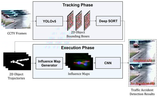 The execution phase consists of two parts: an Influence Map Generator and a Detection Executor. The Influence Map Generator focuses on analyzing the spatiotemporal relationships among the trajectories of 2D objects using influence maps. The Detection Executor extracts the features of the corresponding influence map using a CNN and then classifies whether an accident has occurred or not. Figure 1 shows a block diagram illustrating the procedures involved in the tracking and execution phases for detecting traffic accidents.