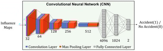 A CNN was utilized to distinguish the given input influence maps and assign significant learnable weights and CNN biases to the influence maps. The CNN, which is comprised of five convolutional layers, five max-pooling layers, and fully connected layers, received RGB three-channel influence maps with a size of as inputs. In particular, each convolutional layer utilized a kernel and was followed by a max-pooling layer. The second and fifth convolutional layers had 64 and 512 channels in their output, respectively. The max-pooling layer utilized a kernel with a stride of . The max-pooling layer maximized the retention of the extracted spatiotemporal features from the influence maps and minimized the dimensionality of the feature map of the convolutional layers. Additionally, batch normalization and a rectified linear unit (ReLU) activation function were added to the convolutional layers before the corresponding max-pooling layers. Batch normalization was used to perform normalization processing on the influence maps, which prevented the network from becoming unstable for the ReLU activated on the influence maps because of its large size. The nonlinearity of the ReLU activation function helped to avoid gradient disappearance and accelerated the CNN training. The last three layers were fully connected with sizes of , , and . The last fully connected layers were utilized to obtain the results of traffic accident detection, which were either an accident or no accident. We used the SoftMax function for detection. The SoftMax function converted the output of the last fully connected layer and produced a probability distribution over the two classes, indicating the likelihood of an accident or no accident. Figure 4 shows the architecture of a CNN in the proposed method.
