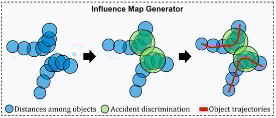 where is the area of the object bounding box, and and are the width and height of the object bounding box, respectively. For the object trajectories in the influence map notation, the trajectory coordinates based on the movement of the objects in each frame were drawn with red lines, and the sizes of the red lines were maintained. First, the distance between any two objects was calculated for each 2D object trajectory in the Influence Map Generator, and a blue circle was drawn on the corresponding trajectory coordinate point. The value of accident discrimination was then determined based on each area of the object bounding box, and a green circle was drawn at the corresponding trajectory coordinate point according to the value. Finally, red lines were drawn based on the coordinates of each 2D object trajectory to represent the corrected and smoothened 2D object trajectories. Figure 5 illustrates the influence map generator processes.