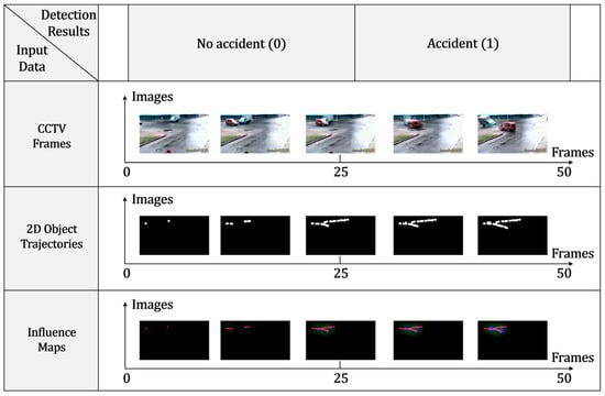 The input data for the traffic accident detection method included CCTV frames, 2D object trajectories, and influence maps. Figure 6 shows the input data for each part of the proposed method. CCTV frames are video images captured by CCTV cameras. There were 25 accident frames and 25 non-accident frames for each of the 50 CCTV frames. “No accident” is represented by the number 0, and an “Accident” is represented by the number 1. In addition, 2D object trajectories and influence maps were processed in the same manner as CCTV frames.