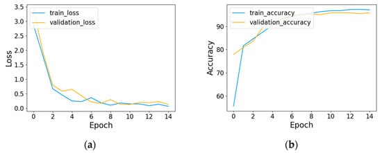 Experimental training and validation results of the CNN-based detector. (a) Loss of the CNN-based detector; (b) accuracy of the CNN-based detector.