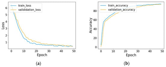 Figure 8b shows the accuracy rate of the CNN-based detector. The CNN-based detector training accuracy sharply increased from 4.67 to 55.4 before the fourth epoch and then slowly increased to 95.2 until convergence. Similarly, after 50 training epochs, validation accuracy increased from 0.75 to 94.38.