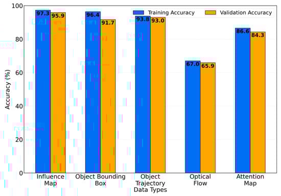 As shown in Figure 9, notable differences in traffic accident detection performance across various approaches were observed in the histogram contrast experimental results. When an influence map was employed, the highest training and validation accuracy of 97.3 and 95.9 were achieved, respectively. In contrast, using an object bounding box [] resulted in a training accuracy of 96.4 and a validation accuracy of 91.7. In the experiments with an object trajectory approach, the training accuracy reached 93.8, and the validation accuracy was at 93.0. The optical flow approach [] exhibited substantially lower traffic accident detection performance, with a training accuracy of 67.0 and a validation accuracy of 65.9. Finally, the attention map approach [] achieved a training accuracy of 86.6 and validation accuracy of 84.3. Within the domain of traffic accident detection tasks, the influence map approach exhibited a strong superiority in performance with respect to the other approaches. The influence map approach accounts for the spatiotemporal relationships among objects and provides more meaningful information. The disparities in performance display the significance of the influence map in enhancing the performance of the model in traffic accident detection tasks. Consequently, the effectiveness of influence maps is highlighted, as they exceeded the alternative input data types in both the training and validation stages.