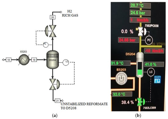 The naphtha HDS with a stabilization and splitting unit (U7501) was designed for preparing the feedstock of modern catalytic reforming and isomerization units within the Basrah Refinery. Naphtha receives input from U7501 and sends it to a catalytic reforming unit which comprises paraffin ranging from C6 to C11, naphthenes, and aromatics. The main objective of this reforming process can be summarized as generating high-octane aromatics to use as a blending component in gasoline of high octane. The hydrogen is created by the vapor phase of D5204. Hydrogen is used to generate an upstream to control the pressure of the valve that is used to power the naphtha hydrotreatment unit (Figure 2). RD-D5204 separated liquid is delivered to the stabilization section through the gas network that is rich in hydrogen at 24 bar g.