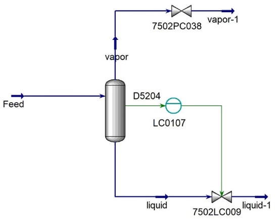 There are many types of industrial applications in which it is important to take into account non-linearity when looking at the stability margins or robustness requirements of a control system. In the refinery industry, tanks are used for separation purposes; they are referred to as “separator drums” or “flash drums”. Separators are an essential component of the entire process of an oil refinery, in which an oil–gas separator is a pressurized vessel that is used to separate a liquid stream into its gas and liquid components; this type of separator is a two-phase separator [8,9]. It is noteworthy that physical changes in the fluid stream may lead to these types of separations, where there are no chemical interactions between the parts of these mixtures, and the boundaries of each phase are very clear. Moreover, the level, concentration, temperature, and mass flow in the feed stream all have a significant influence on the efficiency of the separator drums; therefore, a robust control system is needed to control the separation process [10]. To achieve this goal, the separation process should be modeled to design a high-performance controller for the separator drum [11].