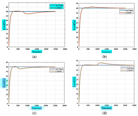 Figure 13 and Table 4 show a system response in the case of disturbances. Different methods of disruption are included, such as increasing or decreasing the input feed (m2) and increasing or decreasing the opening valve (yi). After testing the system in the case of optimizing the PI parameters using the RL approach, the results reveal the good performance of the proposed system.