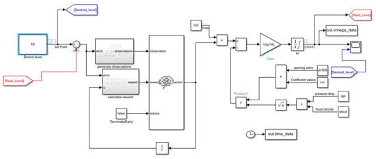 This section focuses on validating the D5204 system using MATLAB, as well as the simulation of the real industrial system by designing several experiments. Therefore, the first group of experiments evaluates the performance of the closed-loop system by using a PI controller, and then an auto-tuner is used to optimize the performance of the system; finally, we validate the use of RL to optimize the PI controller for the best performance. The second group of experiments uses the RL agent as an online tuner to optimize the PI parameters; in this case, the RL system works as an RL PI-like controller of RD5204. The D5204 system that is designed by Simulink is shown in Figure 4, and the real parameters of the D5204 system in the process unit of the Basrah Refinery are listed in Table 1 [7].