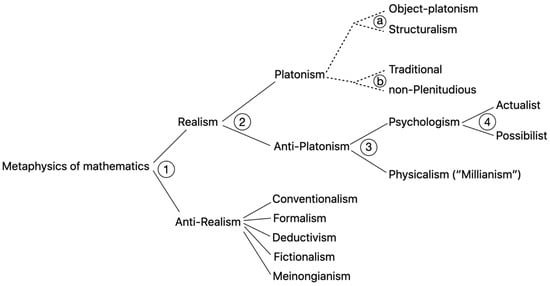 Before attempting to make a specific theoretical contribution to mathematical realism (known as “Millianism”), it is useful to review existing schools of thought in the ontology of mathematics. This review simultaneously provides a list of key questions that the responses to constituting the different schools of thought. In the reviewing process, the division given in Balaguer (2009) [1] is schematically reconstructed. According to Balaguer, only two views of the metaphysics of mathematics manage to adequately answer all objections: these are Platonic set theory (as a form of realism) and fictionalism (as a form of anti-realism) (see Figure 1). Balaguer takes a relatively reserved stance towards the dilemma that one of these two perspectives is correct through three epistemic conclusions: (a) we have no reason to believe or not believe in abstract mathematical objects, (b) we can never in principle have a reason to believe or not believe in abstract mathematical objects, or (c) there is no material fact that could determine between Platonic set theory and fictionalism, although both adequately answer all objections (except, in a way, the question of proving the existence of abstract mathematical objects). The first key question that divides the metaphysics of mathematics into two domains, marked with (1) in Figure 1, is the question of whether mathematical theories represent truthful descriptions of some real part of the world. Realistic theories answer affirmatively, while anti-realistic theories answer negatively, claiming that mathematics has no ontology, or that its concepts are objectively empty. The question marked with (2) further divides the realist camp into two groups and is “are mathematical objects spatiotemporal?”. Platonic set theory answers negatively, while anti-Platonism answers affirmatively. The question marked with (3) further divides anti-Platonism into psychologism and physicalism and reads: “what is the nature of mathematical spatiotemporal objects?”. According to psychologism, the objects in question are mental objects, or mathematical statements represent truthful descriptions of mental objects, while according to physicalism, the subject of mathematical statements is non-mental parts of physical reality.