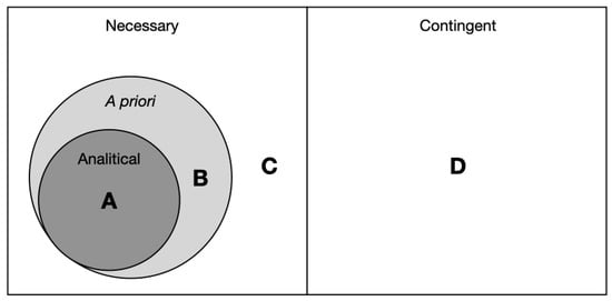 What does a priori actually mean? A priori knowledge and justification is that which is independent of experience [13]. An interesting description of a priori was given by the British philosopher Galen Strawson. For him, an a priori argument is one for which you can know that it is true by lying on your couch, and for whose evaluation you do not need to stand up, leave, and examine things in the physical world, or engage in science [14]. The description does not specify whether the use of language in such consideration is allowed, because if it is, then this descriptive definition at least partially matches Kant’s concept of the analytic [15], which already creates confusion. That is, with the assumption of mastering language on the same couch, we could draw analytic judgments, for example, that the expert knows or the worker works, which are classic examples of analytic judgments. In addition, Strawson’s answer relates to the question of what a priori knowledge or argument means, while the question at the beginning of Section 2 was, however, what a priori means, not what a priori knowledge, justification or argument means, so his answer is not actually the correct answer to the question posed. The concept of a priori can possess at least three levels of meaning, which are usually used intuitively and insufficiently differentiated: (a) it is what we can know from pure conceptual analysis (analytic), (b) what does not require empirical verification (necessary), and (c) what exists prior to us (pre-experiential). In the following text, we further specify the way of using the concepts in this study.