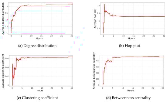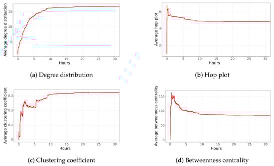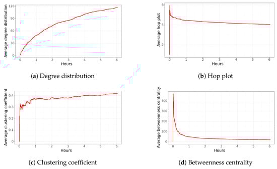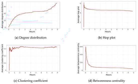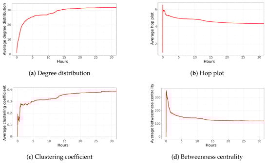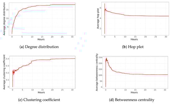 The average hop plot distribution (Figure 5b) reaches a value of 7 in less than an hour, indicating that there is a long distance among users. However, it starts to decrease and obtains a value of 4.9 at 10 h. Then, the network starts to create important connections among users. This behavior is also observed through the average clustering coefficient (Figure 5c) and average betweenness centrality (Figure 5d).
