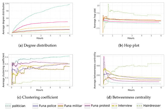 Finally, the average betweenness centrality is shown in Figure 3d. The value rapidly increases from 0 to 225 after 2 h, coinciding with the arrival of the main users who spread the funa. Then, it drops to approximately 100 in the following hours. The change in behavior during these 4 h could be explained by the critical number of new users joining the network and, most importantly, the significant number of new edges created. These new edges were generated because most of the people were connected among themselves, which increases the clustering coefficient and decreases the betweenness centrality.