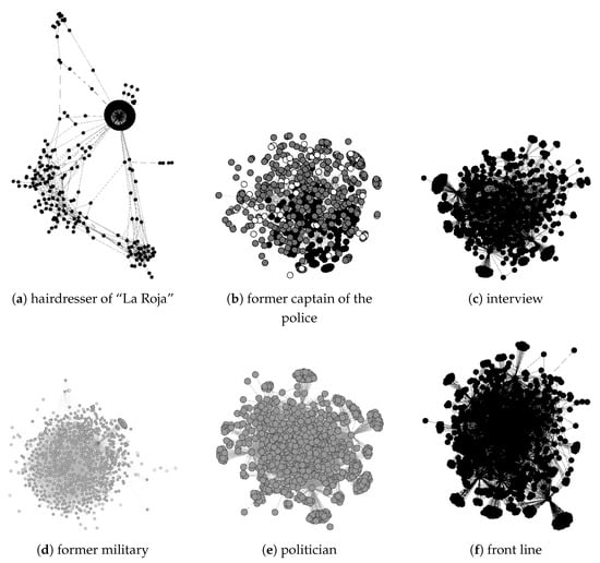 Finally, Figure 9 shows the final six networks generated for the respective tweets. As we can observe, the hairdresser has multiple groups that spread the information separately (top-left plot). The “funa” group, corresponding to the top-middle, top-right, and bottom-left plots, shows multiple interconnected node groups. Finally, the anomalous networks (bottom-middle and bottom-right plots) show many nodes connected among themselves and some small groups connected in the periphery of the network.