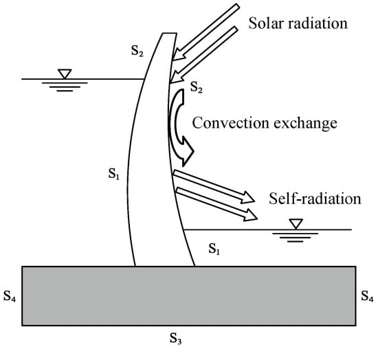Based on the above analysis, the boundary conditions for the temperature-field numerical simulation of the super-high arch dam in the alpine and gorge regions of Southwest China can be classified into four types (S1–S4), as shown in Figure 1.