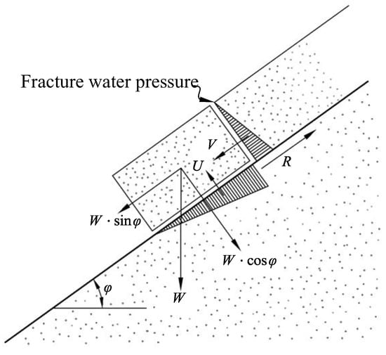 Rock mechanics regard the rock mass as a dual medium composed of a fracture network and a pore medium, in which the permeability of fractures is much greater than that of pores and is the main water-conducting channel for rock seepage. The permeability of pores is relatively small and generally occupies a larger volume in the rock mass than fractures, which can be regarded as the space for water storage. The development degree of rock fractures weakens with the depth, and the degree of fracture system development of the surface rock mass is higher due to unloading and weathering effects, which can be generally regarded as a through network. The proportion of non-through fractures inside the mountain increases with depth. Due to the good permeability of fractures, the flow of reservoir water in the fracture system is relatively fast, and the groundwater level of the bank mountain rises rapidly, which can reach the same level as the reservoir’s water level in a short time. The entry of reservoir water into fractures changes the equilibrium state of the surrounding rock blocks of the fractures, as shown in Figure 2. The water pressure in the fractures generates two forces, the downward water thrust force V and the uplifting force U, and the limit equilibrium condition of the rock block can be expressed as follows.