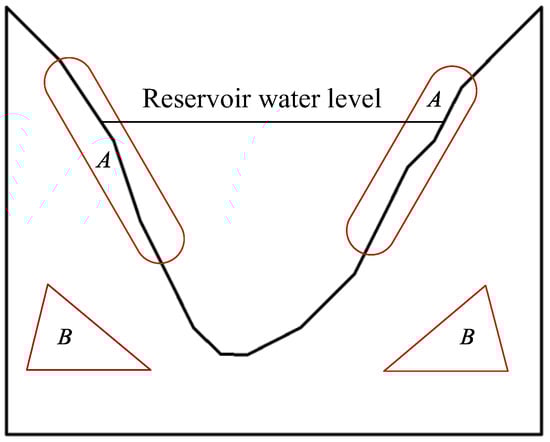 Figure 3 shows a schematic diagram of the cross-section of a typical high arch dam valley. The stress in high mountain and canyon areas is generally high. Based on the tests conducted by Wu et al., the shallow rock masses of the reservoir bank slope (Zone A in Figure 3) can be approximately regarded as being under the uniaxial stress state. After water storage, the water pressure mainly exerts tension on structural surfaces such as fractures, causing the rock mass to expand and deform towards the valley, resulting in the valley contraction. Most of the rock masses inside the mountain (Zone B in Figure 3) can be approximately regarded as being under the triaxial stress state. The long-term deformation and fracturing-evolution history lead to the development of jointed fractures in the rock mass. After water storage, the fracture water pressure increases, the effective stress decreases, and tension deformation and shear deformation are prone to occur, which also leads to valley contraction on the reservoir bank.