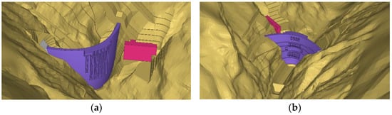 Although some scholars have simulated the dam’s temperature field by considering solar radiation [11,13], most of them only focused on the uneven temperature distribution on the surface of a high arch dam. Then, they studied the unfavorable stress and cracks caused by solar radiation during construction and operation periods. Therefore, these studies did not comprehensively analyze the dam deformation characteristics under the influence of solar radiation. The numerical calculation and analysis results in this work can clearly reflect solar radiation’s effects on a super-high arch dam’s deformation characteristics, which can be used to partially explain the genetic mechanism of the special deformation of the super-high arch dam in the alpine and gorge regions of Southwest China. Most studies took the deformation mechanism of valley contraction as the major work, but few studies discussed the mechanism of influence of valley contraction on dam deformation. Hu et al. [21] simply assumed that the relationship between dam deformation and valley width narrow is linear. The above research work in this paper analyzed and quantified the influences of valley contraction on dam deformation characteristics in detail. At present, there is little research focused on the influence of the overhanging effect on super-high arch dams’ deformation characteristics. Based on the birth and death element method, the dam deformation behavior under the influence of overhanging effect during the construction period was calculated in this paper. The numerical simulation results can be applied in the analysis and quantification of the effect of overhanging effect on a super-high arch dam’s deformation.