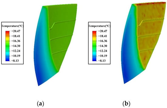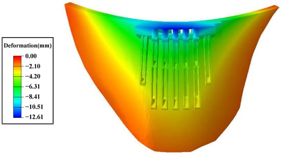 In Figure 28 and Figure 29, it can be seen that the radial deformation field of the dam is symmetrically distributed along the arch beam. The upper part of the dam deforms in the upstream direction, and the maximal deformation occurred at the top of the arch beam, reaching 13.09 mm. The radial deformation of the dam caused by the valley’s contraction is opposite to the dam deformation caused by the reservoir water’s thrust, which partially explains the problem of miscalculated deformation monitoring data of some super-high arch dams in the alpine and gorge regions in Southwest China.