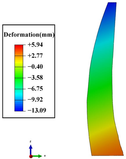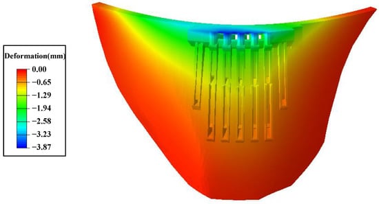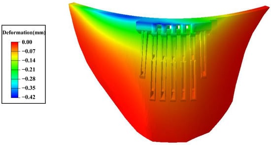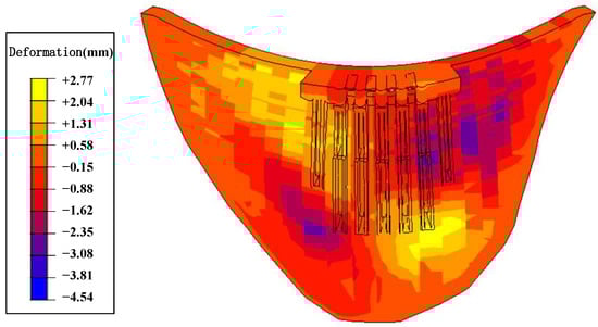 Valley contraction will exert a strong squeezing effect on a super-high arch dam. The influence of valley contraction deformation on a super-high arch dam’s deformation was calculated based on the FEM, and those of the radial deformation of the super-high arch dam and the radial deformation of the arch’s crown beam section are shown in Figure 28 and Figure 29, respectively.