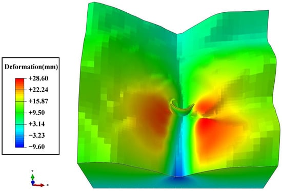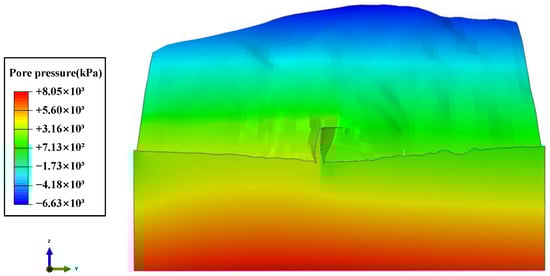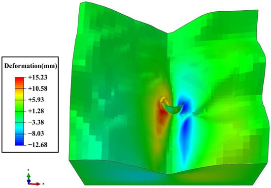 The rock mass at the reservoir bank undergoes contraction deformation in the horizontal direction and upward deformation in the vertical direction due to the transition from the unsaturated to saturated state, as shown in Figure 27. When comparing Figure 26 with Figure 27, it can be found that the rock-mass areas with greater deformation in the horizontal and vertical directions are essentially coincident, indicating that the reservoir-bank mountain has a strong tendency towards outward deformation under the influence of seepage, which is manifested as an expansion deformation.