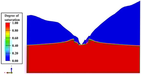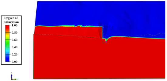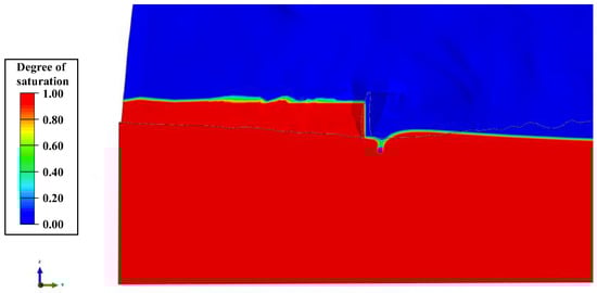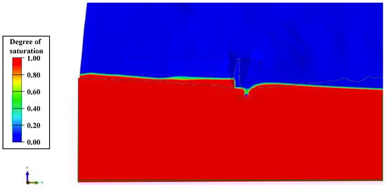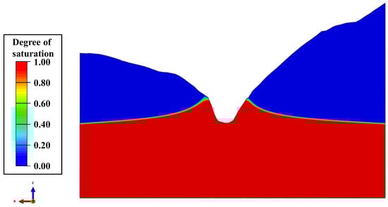The actual water storage process of the special high arch dam is divided into four stages. In the first stage, the reservoir’s water level rose from 1650 m (elevation, hereinafter the same) to 1707 m. In the second stage, the reservoir’s water level rose to 1800 m. In the third stage, the reservoir’s water level rose to 1840 m, but the water level dropped back to 1800 m after water storage was completed. The fourth stage saw the reservoir’s water level rise from 1800 to 1880 m. In this paper, the third and fourth stages were combined as the third stage, and the saturation degree of the rock mass at the arch crown beam section was calculated for each stage, as shown in Figure 23, Figure 24 and Figure 25.