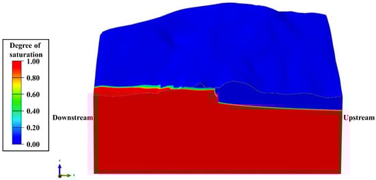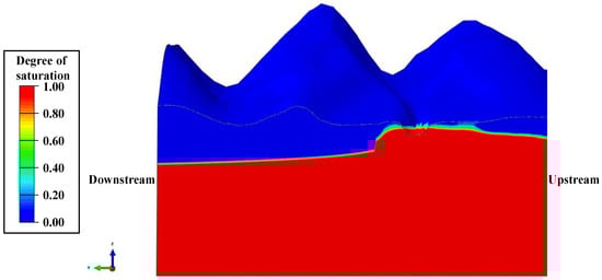 According to Figure 23, Figure 24 and Figure 25, the saturation of upstream rock mass is greatly influenced by fluctuations in the water level of reservoir—the rock mass near the shore transitions from unsaturated to saturated during the reservoir filling process. In contrast, the saturation of downstream rock mass is less affected by water level fluctuations due to the relatively large hydraulic gradient in the seepage-overflow zone of the dam shoulders and downstream of the dam, which is due to the presence of an impermeable curtain and drainage holes in the dam.