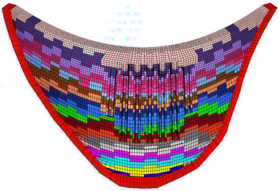 The finite element model for analyzing the overhanging effect was established. A layered and block-by-block approach to apply self-weight for simulating the actual construction process was used. The finite element model is shown in Figure 30. The model had 43,761 nodes and 36,240 elements. Thin-layer elements were used to simulate the transverse joints. In the calculation process, the various layers of elements were activated sequentially. The positive direction of the tangential direction was towards the right bank, the positive direction of the radial direction was towards the downstream, and the positive direction of the vertical direction was upwards. The side and upper and lower faces of the dam foundation were subject to normal constraints, and the bottom face was fully constrained.
