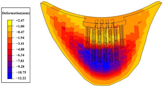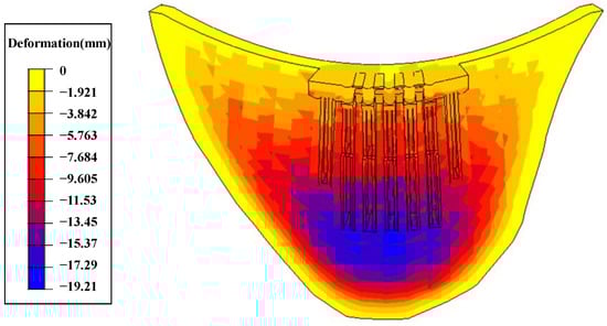 Based on the pouring progress data from 23 October 2009 to 23 December 2013, the self-weight load was applied, and the elastic modulus of the dam body and the deformation modulus of the dam foundation were obtained through laboratory tests. Then, the deformation of the dam body under the influence of the overhanging effect was calculated. The radial, tangential, and vertical deformation of the dam body are shown in Figure 31, Figure 32 and Figure 33.