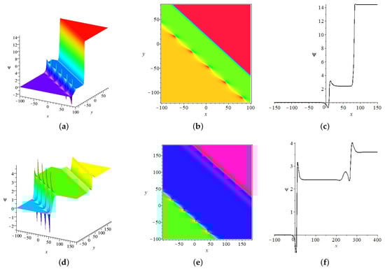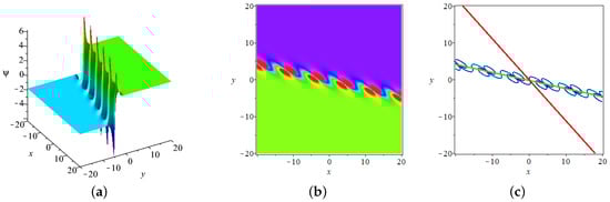 - It can be noticed that the velocities of the soliton along the x axis and y axis can be written as and , respectively; the velocities of periodic wave along x axis and y axis are and , respectively; the above results are discussed on the plane , and similar conclusions can be obtained on the plane and plane.
