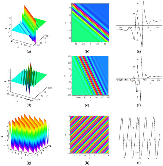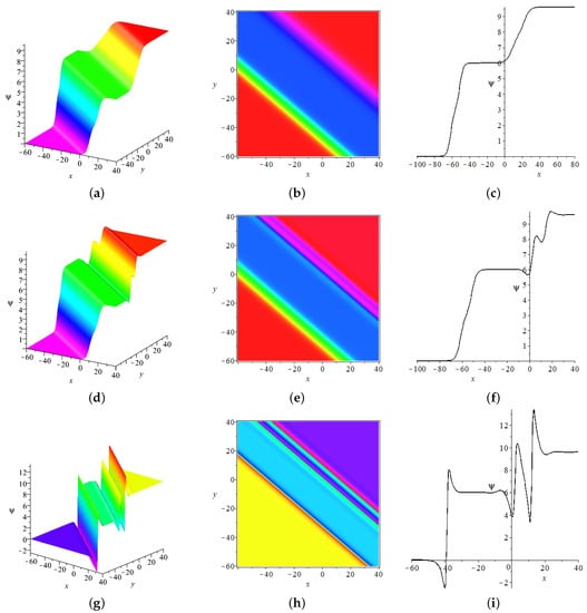 i.e., , then, the two-breather will be transformed into a series of nonlinear waves including the quasi-kink soliton, M-shaped kink soliton, oscillation M-shaped kink soliton, and multi-peak kink soliton, as shown in Figure 10. In Figure 10a–c, the breathers are all transformed into quasi-kink solitons. In Figure 10d,e, they are transformed into the quasi-kink soliton and M-shaped kink soliton. In Figure 10g–i, they are transformed into the M-shaped kink soliton and oscillation M-shaped kink soliton.