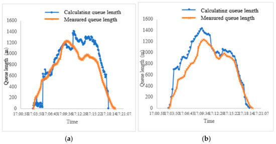 - Example verification demonstrates that the accuracy of the maximum queue-length estimation model based on shock-wave theory is 92.34%, and that the accuracy of the whole-process queue-length real-time estimation model based on shock-wave theory is 83.05%, reflecting the change rule of vehicle queue length under various control measures in real time. The accuracy of the whole-process queue-length estimation model presented in this paper is 83.05%, whereas the accuracy of the input–output model is 73.85%. The accuracy of the maximum queue-length estimation model based on shock-wave theory is 93.62%, while the accuracy of the input and output model is 87.24%; therefore, the model presented in this paper is more applicable.