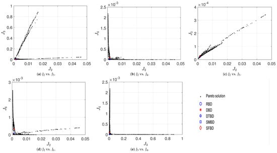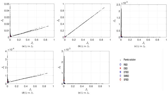 47], the time-independent terms of the shaking moment and shaking force are simultaneously optimized by using a weighted sum approach to suggest a balancing design for various operating conditions (tasks). This results in a unified design approach for the mass distribution scheme and the link shape. Nevertheless, the a priori selected tradeoffs based on the objective performance weights require precise knowledge of the importance of each objective and a process called normalization to scale different orders of magnitude in the objectives. Unfortunately, these requirements are not easy to fulfill because, in the former case, a set of uniformly distributed weights does not result in a set of Pareto solutions that are also uniformly distributed, which makes it challenging to set weights in order to achieve a Pareto solution in a desired area of the objective space. Moreover, in the second case, the normalization must be performed by solving several single-objective optimization problems, one for each objective function. This is a very time-consuming task. In addition, the weighted sum approach has problems in non-convex Pareto fronts (it cannot find solutions in this type of front).