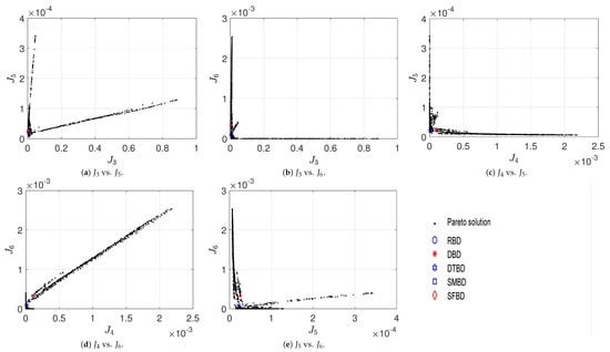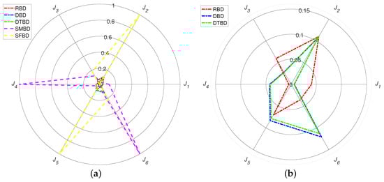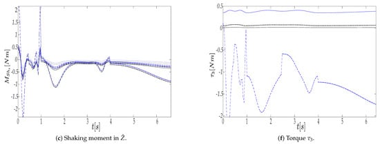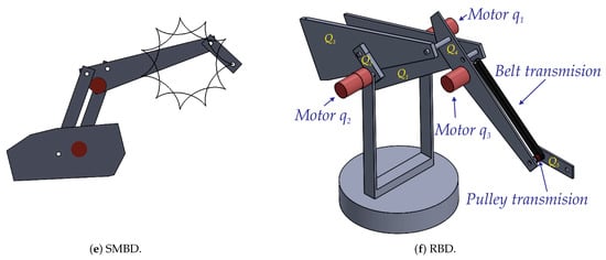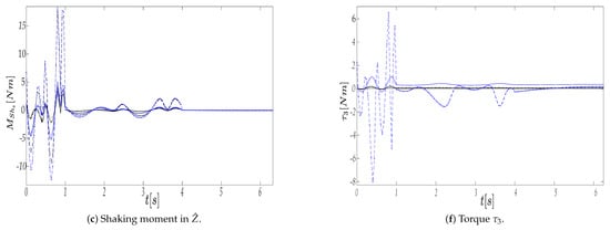 The comparative results of the performance function changes with different loads () in the end-effector of the robot indicate that the RBD presents an outstanding reduction in the time-independent terms of the shaking force balancing around , shaking moment balancing around , and torque around with respect to DBD. Thus, the performance function is less influenced by the load parameters because of the reductions in their sensitivities.