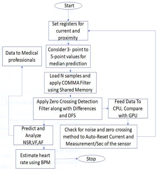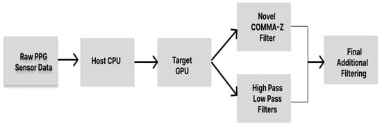 The proposed system operation is defined in Figure 2: the PPG sensor is placed at the earlobe for this research work, since placement of this sensor at the wrist is more prone to artifacts for any kind of activity. For experimental results and comparison, sensors are placed both at the earlobe and fingertip. The CPU reads all the earlobe device sensor-based data and then loads all the data to the GPU. The raw sample data are divided into a number, N, of thread blocks for parallel processing, and later the GPU output offloads the results back to the CPU for any further computation. The target GPU comprises of the COMMA-Z implementation and related signal differentiation filter, along with DFS algorithm, for prediction of Ventricular and Atrial Fibrillation diseases. Detailed design and algorithm structure are discussed in the software and hardware section of this paper. The traditional moving average filtering techniques were demonstrated and implemented in our previous publications while comparing to Apple Watch, but this work showcases how a moving average filtering technique on a GPU was better than a traditional moving average filter on a CPU and Apple Watch [], KardiaBand Mobile app or any other third-party device.