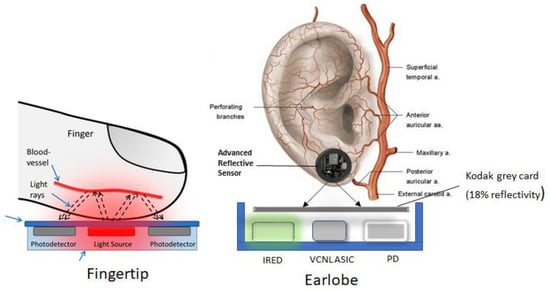 In this section, various methods were used to compute raw data for Atrial and Ventricular Fibrillation using sensor implementation. The methodology used to predict heart rate was via the earlobe in this paper, but fingertip is also widely-used in hospitals. However, the varying signals and noise corrections can be applied widely in earlobe as well and then compared to the fingertip, due to there being more blood vessels in the earlobe and chosen red light penetration depth into the skin, allowing a multi-spectroscopy approach for better sensor accuracy []. The fingertip-measuring waveform and the earlobe-measuring waveform vary slightly: the fingertip waveform shows an R-peak with systolic and diastolic states, but the earlobe sensor shows the P-peak. The VCNL high-precision proximity sensor on the earlobe is a combination of a photodetector, VCNL ASIC and IRED. The IRED was a combination of both red and green light and, herein, we used red LED to perform experiments. The Kodak grey card reflective material was 18 percent better than the traditional reflective devices, which improved and enhanced the light throughput deeper into the skin, and absorbed it back more efficiently, as shown in Figure 3. Figure 3 depicts an earlobe with arteries and veins.