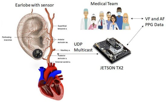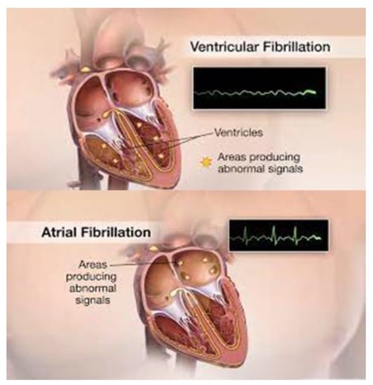 Here, the external carotid was connected directly to the heart valves. The earlobe is one of the strongest pressure points, with very few artifacts when compared to the fingertip. To keep up with preliminary testing, the patient or the user wore the PPG sensor on the earlobe. The sensor data were collected based on the COMMA-Z classifier applied to GPU, which is discussed in the software design section, and the GPU-computed data were sent to medical professionals to monitor, predict and understand heart-related arrythmias and arising conditions. As shown in Figure 4, we observed the conditions in the ventricle and atrial areas of the heart for Ventricular and Atrial Fibrillation diseases. Both these conditions are considered dangerous and troublesome. These conditions should be well-understood and treated. Medically, various methods are used to diagnose these diseases, but early detections are challenging; relevant research is developed and discussed in this paper. To do this requires thorough understanding of the heart to develop the research work; the EKG Guy online cardiology course, conducted by surgeons and PubMed cardiovascular training group, was helpful for this [].